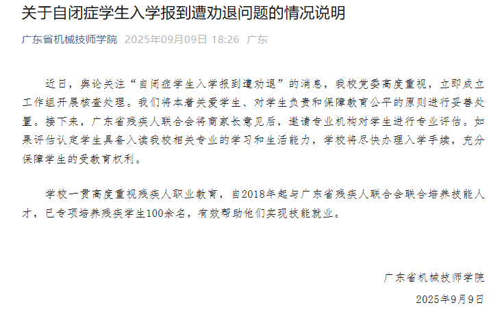 最近,不少媒体关注孤独症学生入学广东省机械技师学院遭到劝退一事股票金融配资,9月9日下午,该校对此进行回应: