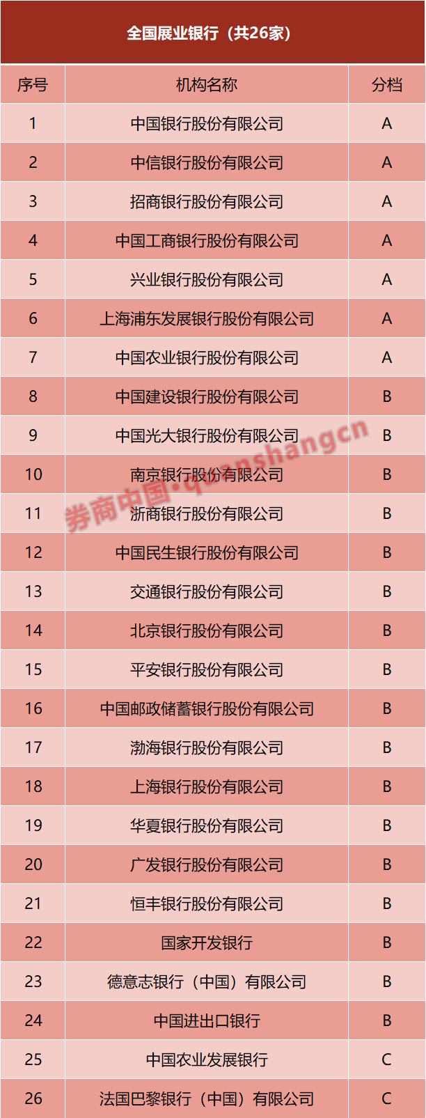 全国展业银行有26家,其中A类7家,B类17家,C类2家。地方展业银行28家,其中A类5家,B类18家,C类2家,D类3家。证券公司18家,A类5家,B类10家,C类3家。